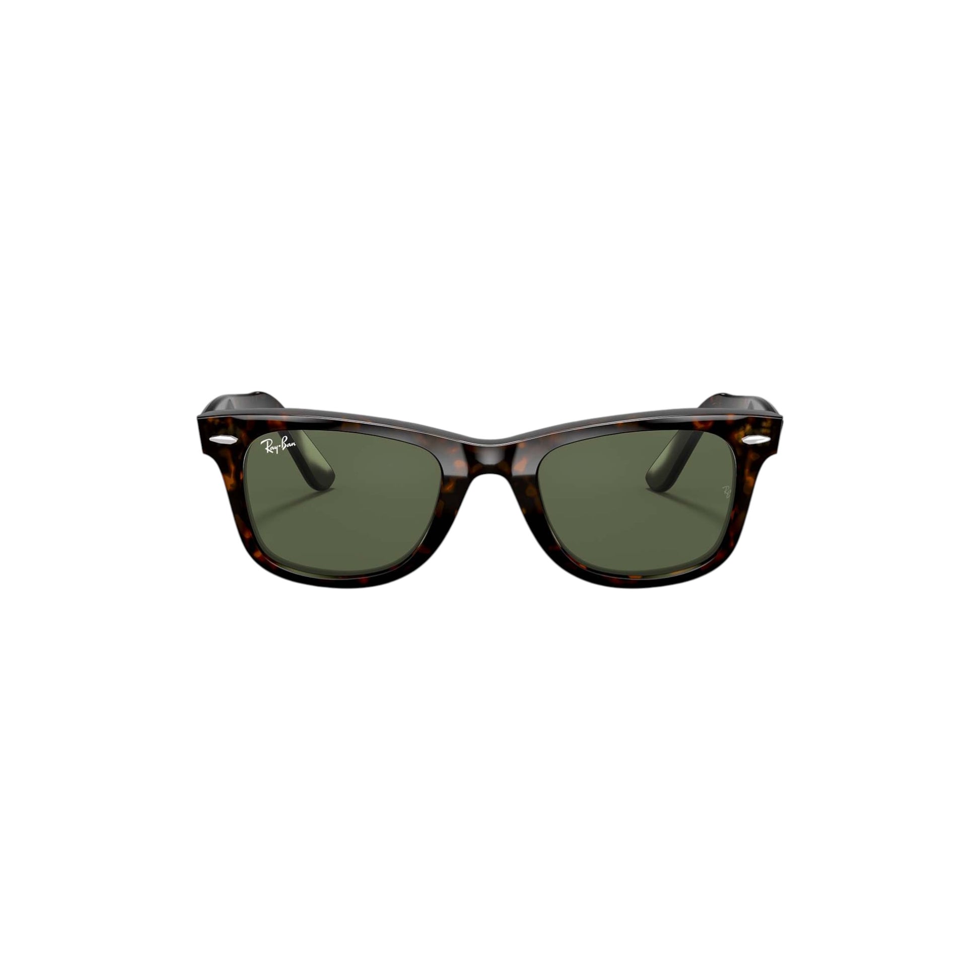 Os óculos de sol Ray-Ban Wayfarer Preto apresentam armação em acetato de formato quadrado em havana, com lentes verde sólidas. Unissexo.